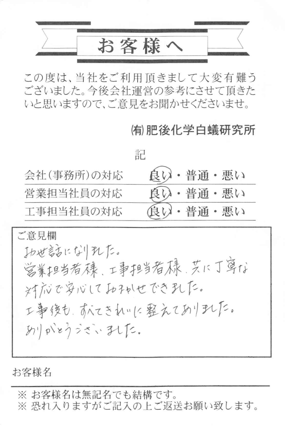 植木町にお住いのO様からお葉書を頂きました先日の予防工事では大変お世話になりました。 今後ともしっかりと対応させて頂きますので 少しでも気になる事など御座いましたらお気軽に ご連絡下さい。 お葉書本当にありがとうございました。 営業担当 須ア 工事担当 龍・横田 |