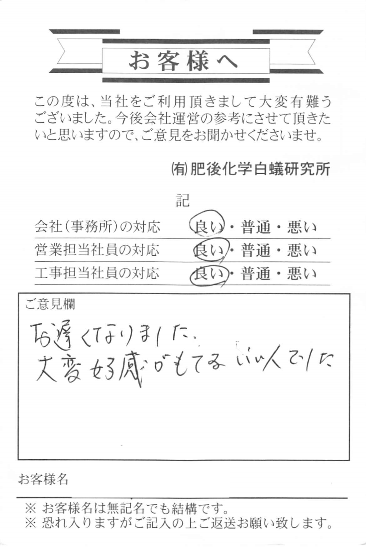 菊鹿町にお住いのK様からのお葉書を頂きましたまだ、建物自体も新しく綺麗で 床下の方も綺麗でした。 可愛いワンちゃんもいらっしゃまして 癒されました。 有難うございました。 今後ともしっかりと対応させて頂きますので 宜しくお願い致します。 推進 亀井 中村 |