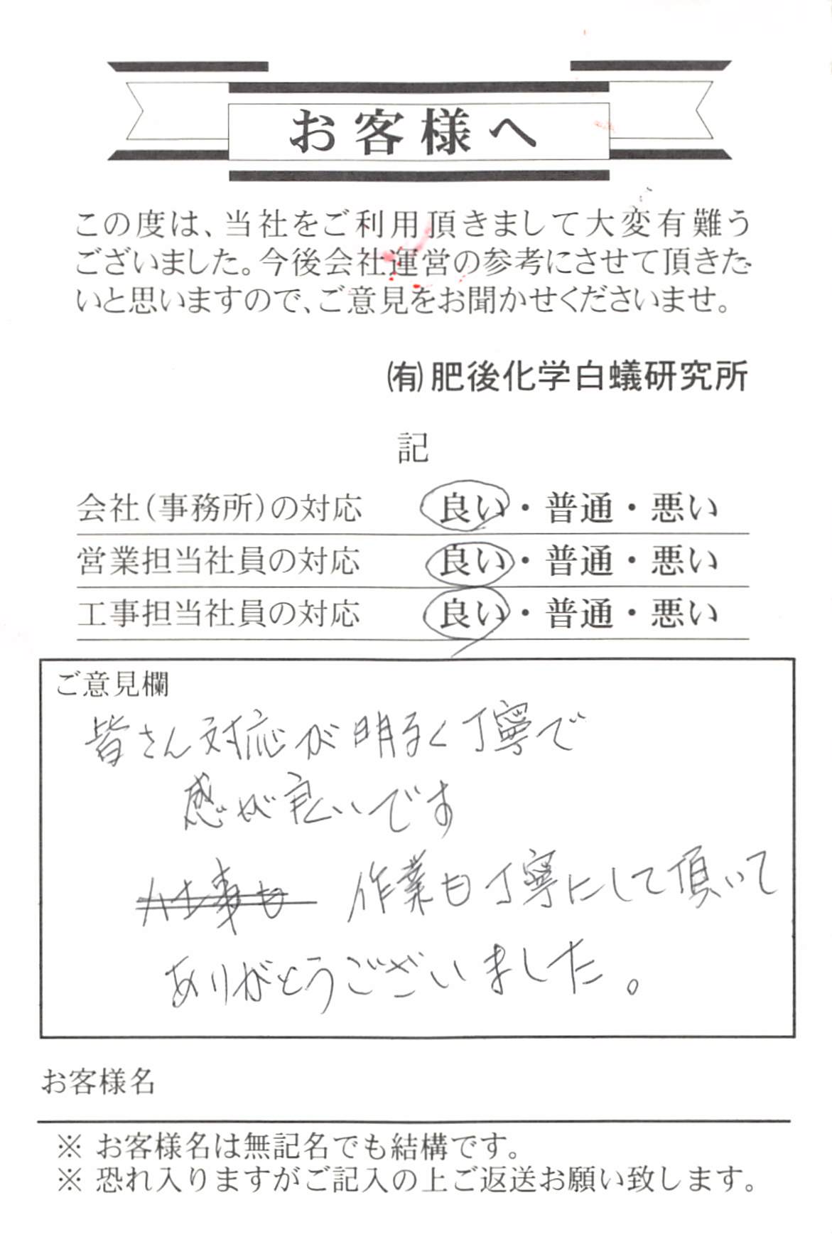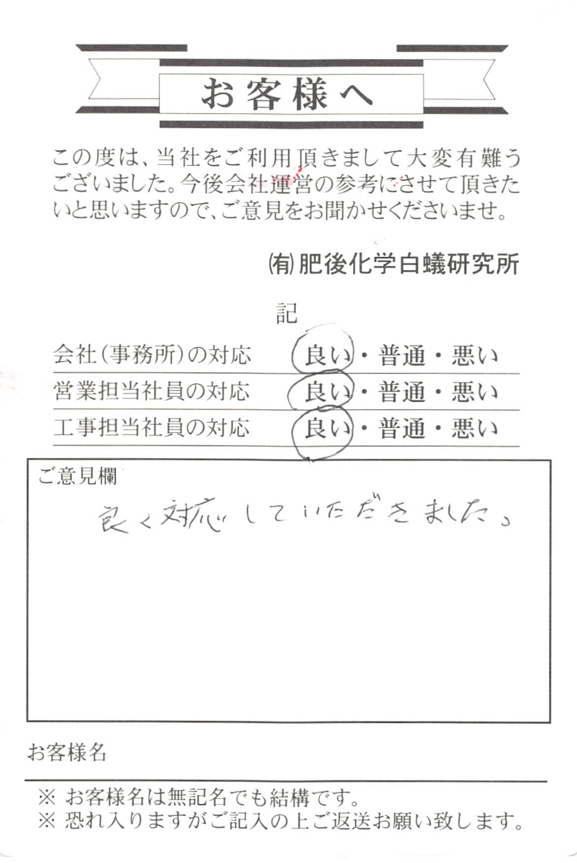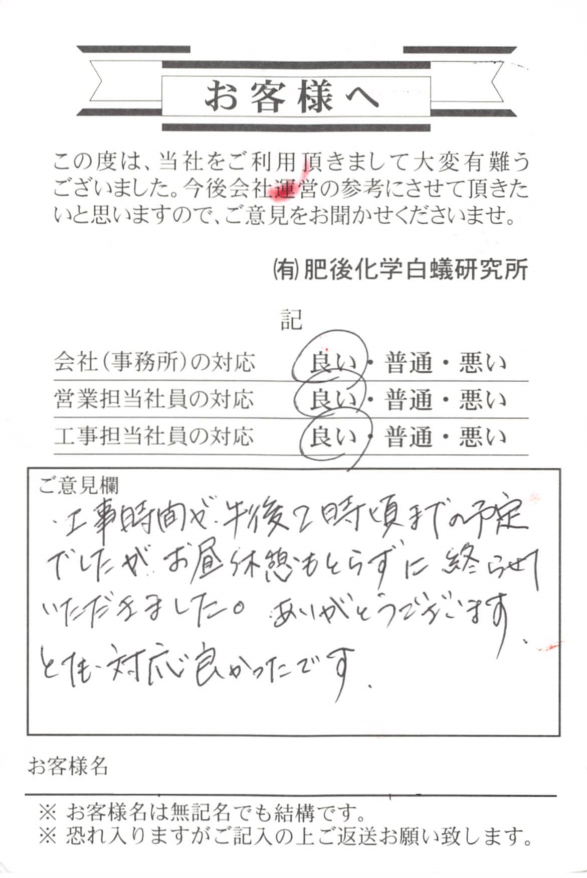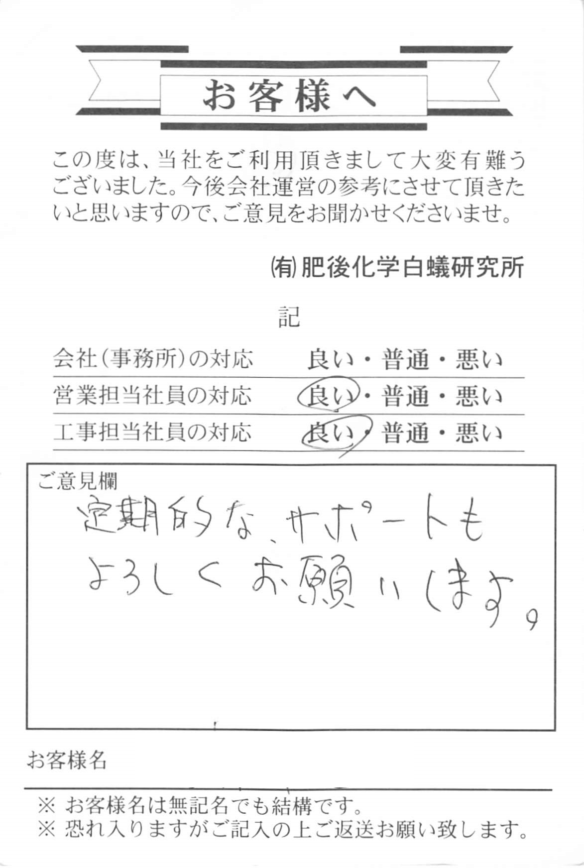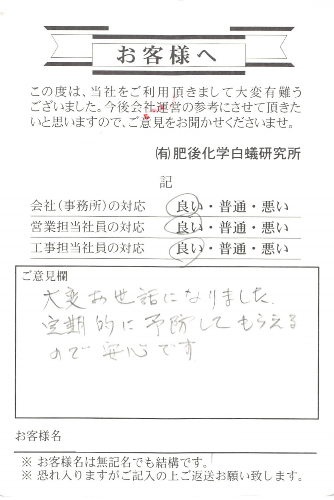 玉東町のT様よりお葉書を頂きました。たまたま、ご近所で白蟻の発生があり皆さんが気にして ある時に、私が訪問しまして、タイミング的に丁度良かったのかなと 考えておりました。約20年前に自社で施工いたしておりまして 幸いの事に、白蟻の生息はありませんでした。 予防消毒で済みましたので良かったです。 白蟻が多い地域ですから、気がけて点検に参ります。 宜しくお願い致します。 推進担当 亀井 中村 添付ファイル