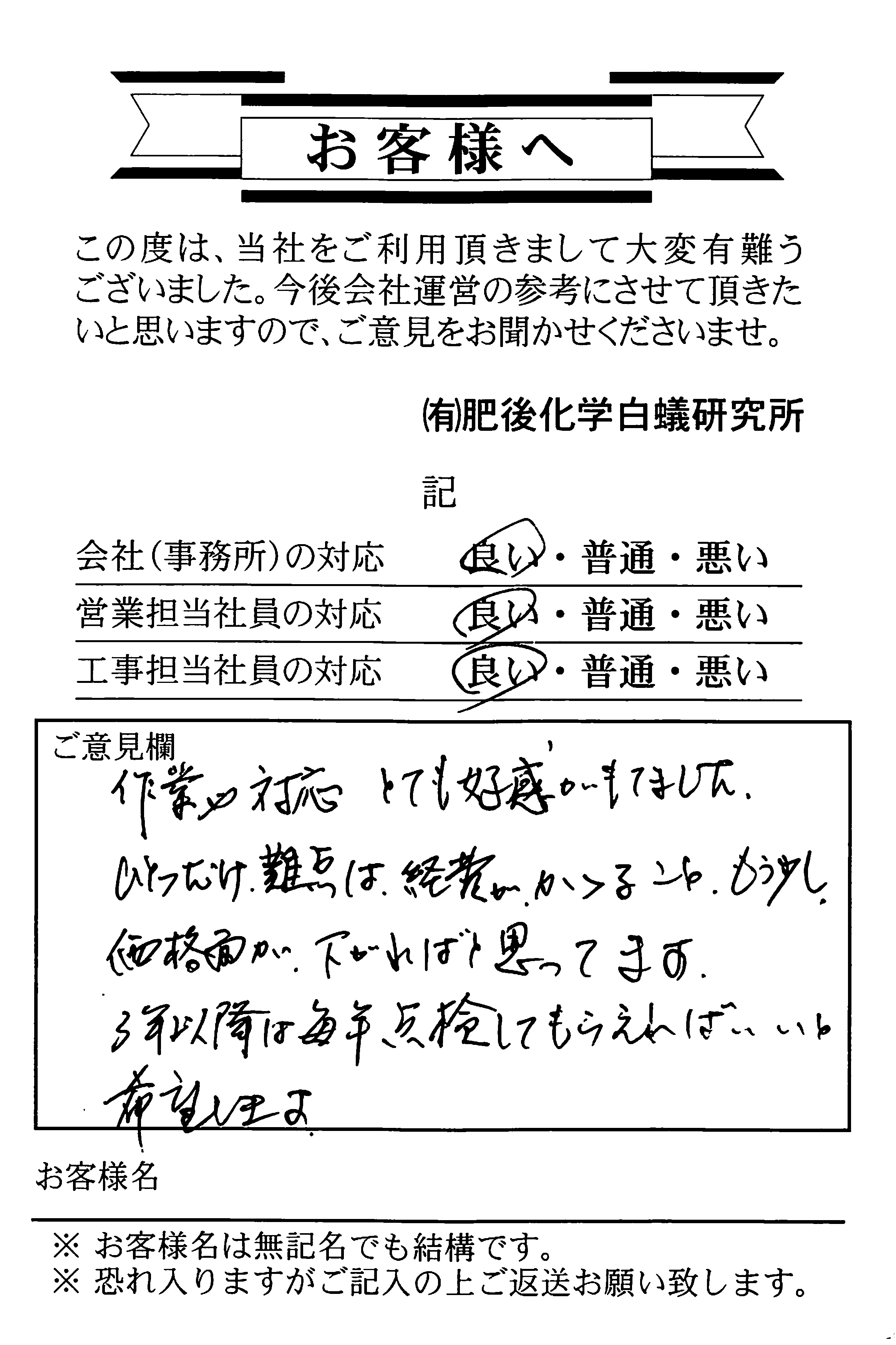 お葉書ありがとうございます。誠にありがとうございます。 新築時の保証は満了となっている状態でしたが、 今回、庭木の杭に白蟻の生息が確認できたことから 白蟻予防工事にてお世話になりました。 建物に白蟻被害が出る前に 予防が出来たので安心しております。 杭につきましては被害が出ているものは 抜かせて頂いておりますのでご安心下さい。 今後も末永いお付き合いを宜しくお願い致します。 営業担当 田尻 工事担当 岩ア・池野 |