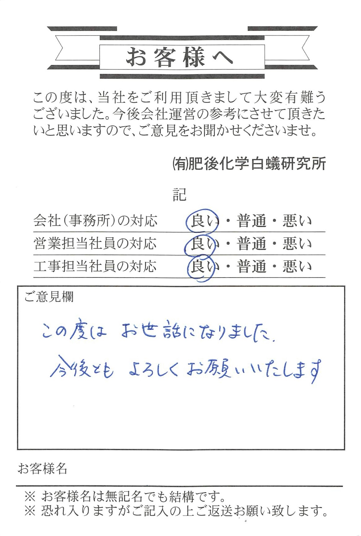 熊本市南区御幸笛田のK様からお葉書を頂戴しました。定期的なメンテナンスを実施させて頂くことで、 白蟻被害にあうことは基本的にはありません。 定期点検でもしっかりと見させて頂きますので どうぞ宜しくお願い致します。 今後とも末永いお付き合いをどうぞ宜しくお願い致します。 営業担当:田尻 工事担当:正木・田上 |
