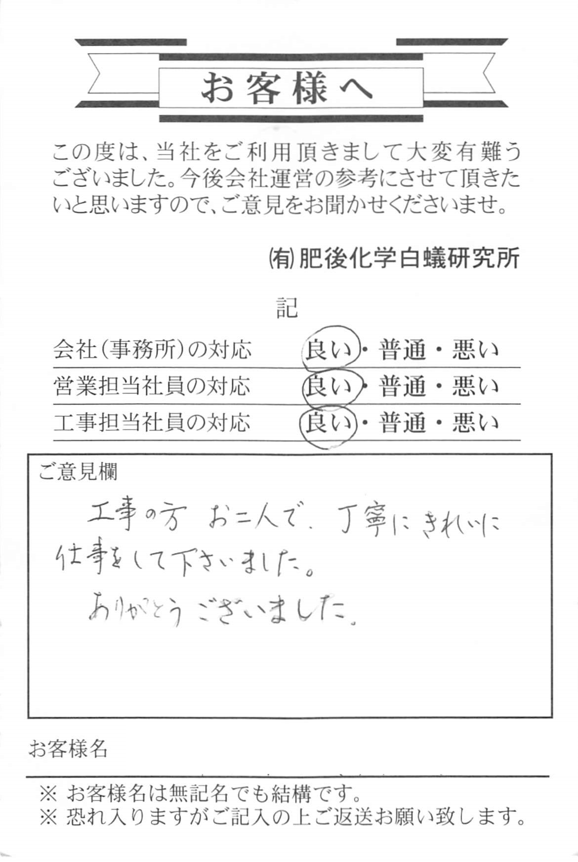 八代市のT様 お葉書ありがとうございます。工事内容に満足いただき、お褒めの言葉を頂戴しました。 大変嬉しく励みになります(^o^)/ これからも、皆様よりこの様な嬉しいお言葉をいただけるよう、施工して参ります。 工事ご依頼及びお葉書の返信誠にありがとうございました。 今後ともよろしくお願いいたします。 工務担当 宮・正木 営業担当 田尻 |