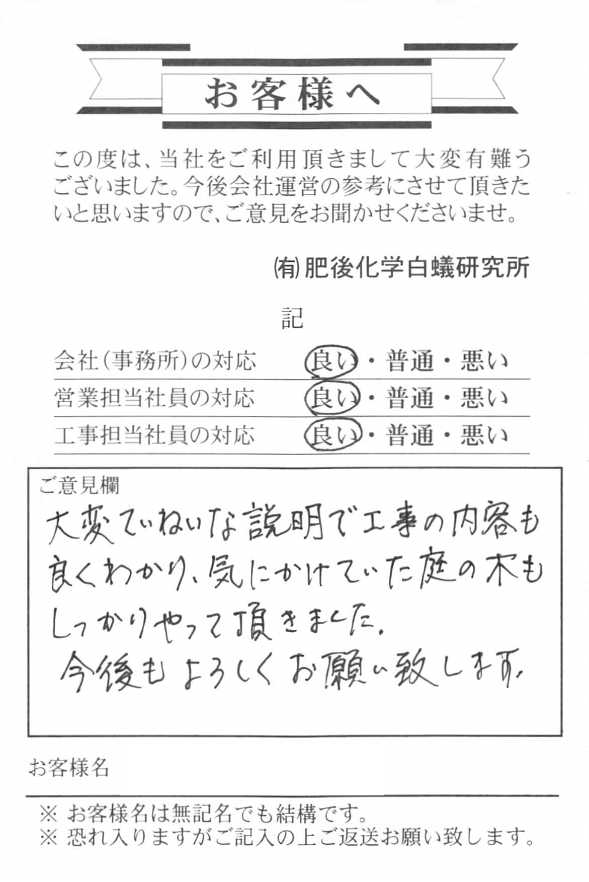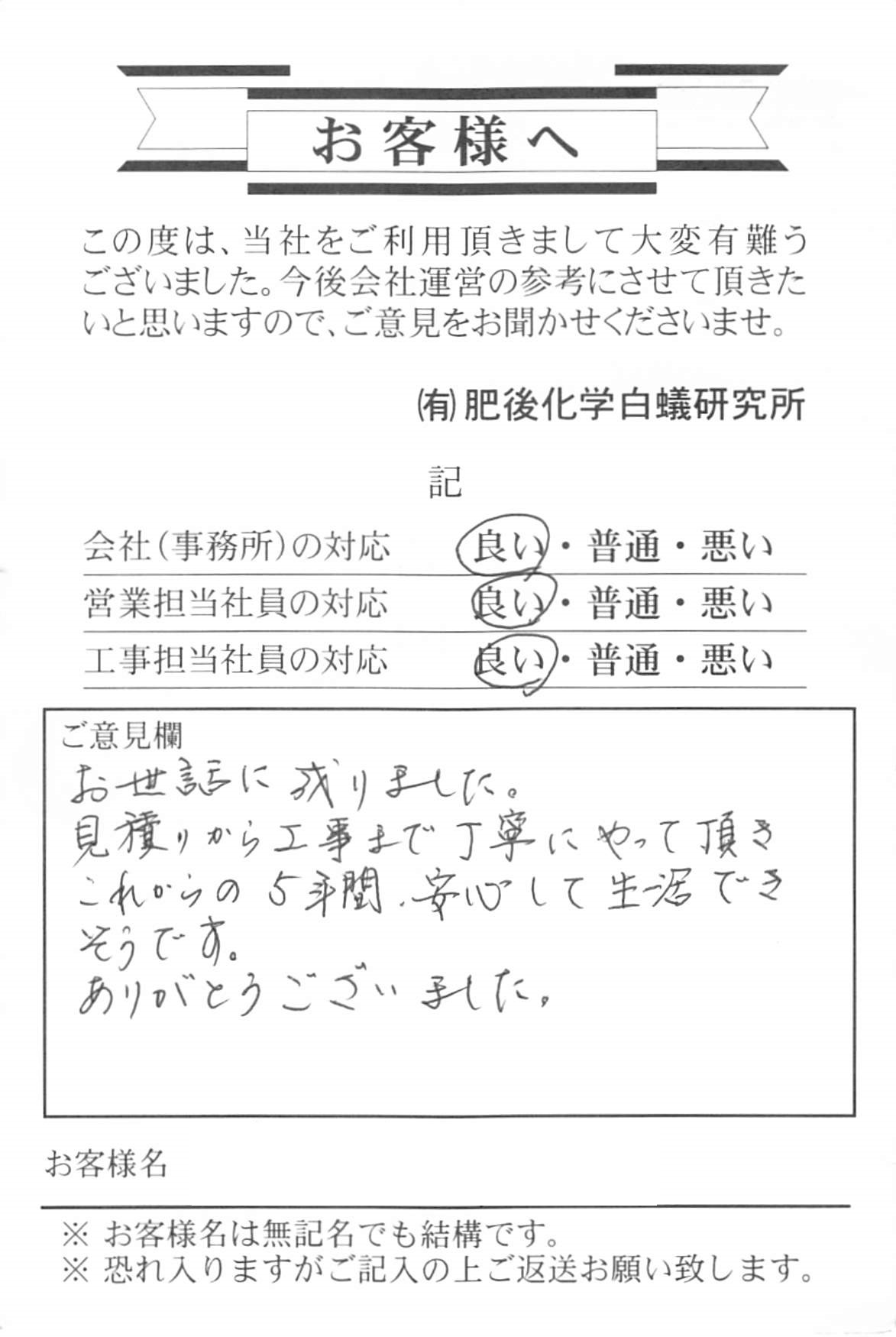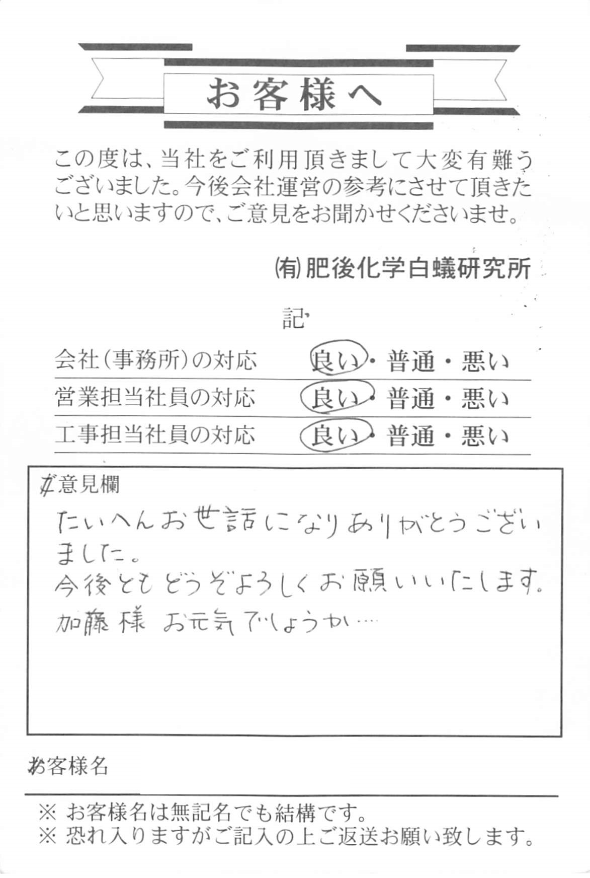 西区にお住いのY様よりお葉書を頂きました。とても嬉しいお言葉ありがとうございます!こちらこそ今後ともよろしくお願いします。 白蟻に関してなどはもちろんの事、その他床下の事で気になる事などございましたらお気軽にお問い合わせください。 お葉書ありがとうございました! 営業 須ア 工務 龍 横田 |